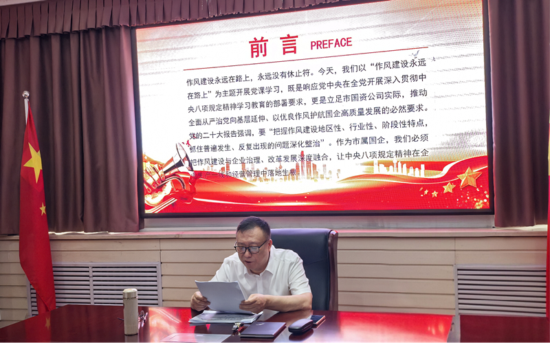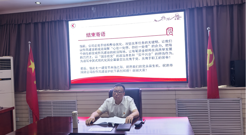 為慶祝中國共產(chǎn)黨成立104周年,市國資公司黨委于6月30日下午在公司大會(huì )議室組織召開(kāi)深入貫徹中央八項規定精神學(xué)習教育專(zhuān)題黨課,公司全體黨員及各子公司主要負責人參加。公司黨委書(shū)記、董事長(cháng)、總經(jīng)理吳立波以“光輝黨史燃斗志,使命責任扛肩頭把貫徹中央八項規定精神、加強作風(fēng)建設進(jìn)行到底”為主題,為全體黨員干部職工、子公司及監管企業(yè)主要負責人講授了一堂主題鮮明、內涵深刻的專(zhuān)題黨課,進(jìn)一步強化了黨員干部的紀律意識,為公司高質(zhì)量發(fā)展提供了堅實(shí)的作風(fēng)保障。